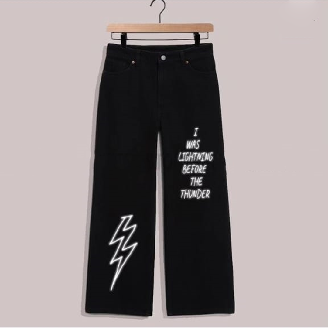 Enhance your wardrobe with Black i was lightning Women's wide leg jeans. Made with high-quality fabric, these jeans provide both style and comfort. The wide leg design offers a trendy and flattering silhouette, perfect for any occasion. Upgrade your look with these versatile and chic jeans.
